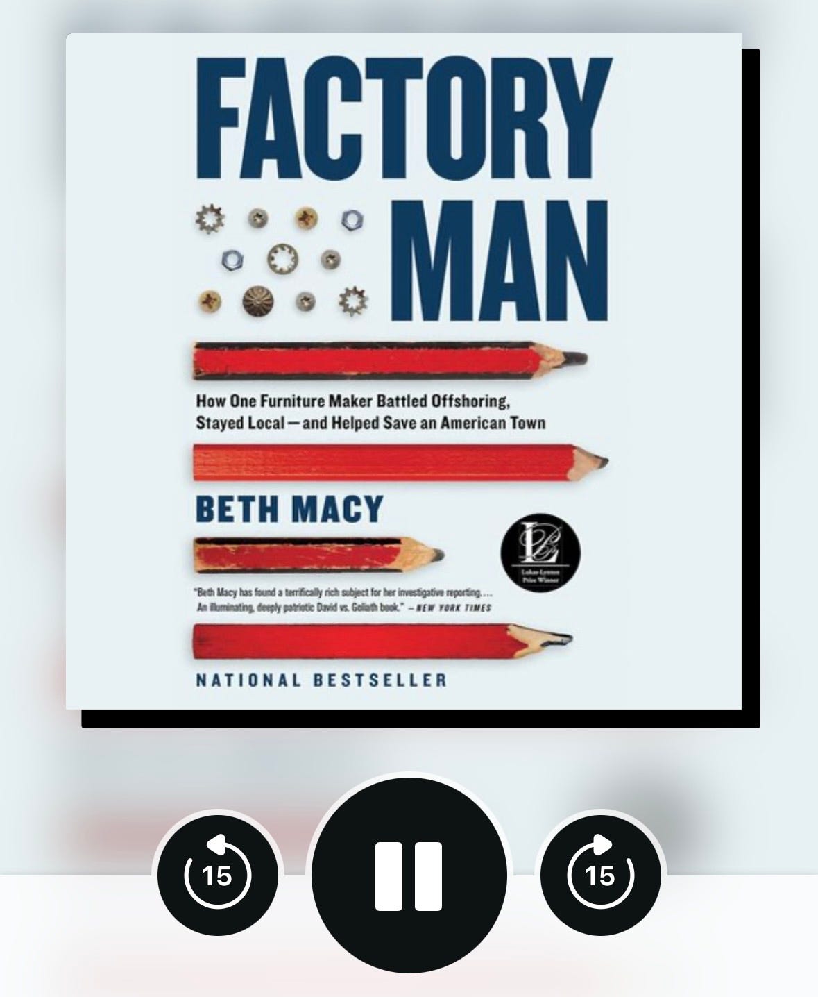 I finished an audiobook over the weekend. Factory Man, by Beth Macy. This New York Times Bestseller was published in 2014 and follows the life of furniture producer family icon John Bassett and his fight against the emerging globalization of his industry to save his Virginia community from ruin.